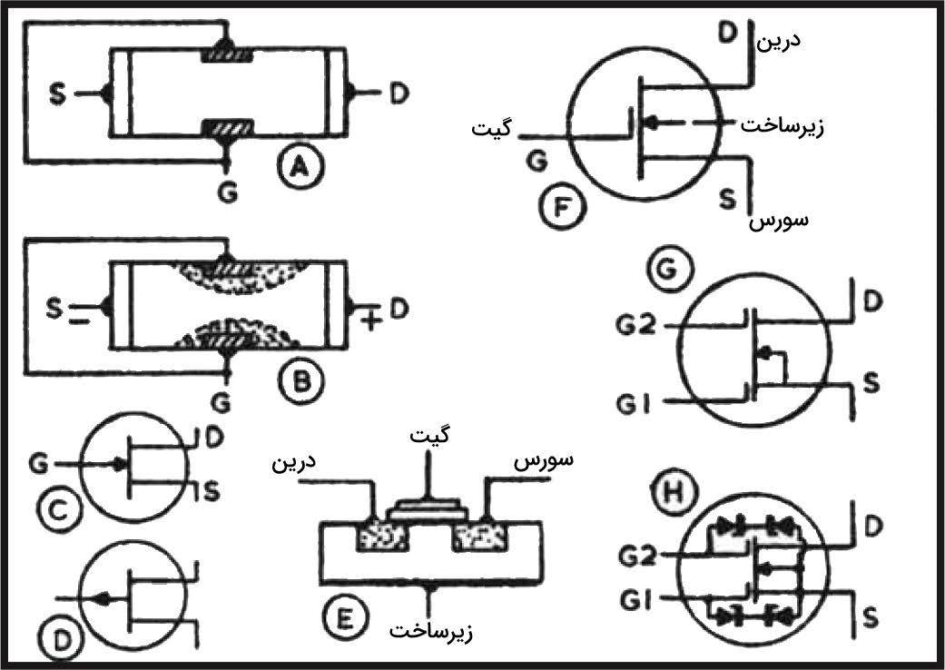 نمونهای از یکFET با گیت عایق در قسمت E نشانداده شده است. بهطوری که ملاحظه میشود، در این حالت، گیت به توسّط لایهی بسیار نازکی از یک مادّهی دیالکتریک و نارسانا، از کانال عایق شده و برخلاف نمونهی نشان داده شده در قسمت A، هیچ پیوندی بین آنها وجود ندارد. در زیرساخت این نمونه، از مادّهی نوع P با حاملهائی که سرشار از حفرههای مثبت میباشند، استفاده میشود. در اینصورت، وقتی گیت منفی باشد، بارهای مثبت، از زیرساخت راهی گیت میشوند و موجبات کاهش پهنای کانال رسانا را فراهم میآورند و باعث کم شدن جریان جاری در مسیر درین به سورس میگردند.از آنجائیکه گیت، عایق شده و ممکن است از مقاومتی در حدود چند صد مگا اُهم برخوردار باشد، امپدانس ورودی آن بسیار زیاد است و در مواردی که وجود این ویژگی (یعنی بالا بودن امپدانس) مدّ نظر باشد، مورد استفاده قرار میگیرد. نمادFET با گیت عایق در قسمت F نشان داده شده است. بهطوری که در قسمت G مشاهده میشود، در صورت تمایل میتوان از نمونههای با گیت مضاعف اینFETها سود جست؛ در این حالت سیگنال ورودی به گیت 1 داده میشود و از گیت 2 برای کنترل بهره استفاده میشود و در مواردی که اینFET در نقش مخلوط کننده بهکار گرفته میشود، گیت 2، نقش ورودی نوسانساز را ایفاء میکند. باید یادآور شد که زیاد بودن بیش از حدّ امپدانس گیت هم خیلی مطلوب نیست و باعث آن میشود که قطعه، مستعدّ آسیبدیدگی شود و از این بابت، نمونههای با گیت محافظت شده، محبوبیّت بیشتری دارند. بهطوری که در قسمت H ملاحظه میشود، در این نمونهها که در حالت معمولی به صورت نشان داده شده در قسمت G میباشند، دیودهائی بین گیتها و زیرساخت و سورس قرار میگیرند. در اینصورت، چنانچه بین مدارات سورس و گیت یک اختلاف پتانسیل بیش از چند ولت پدید آید، دیودها هدایت میکنند و از آسیبدیدگی عایق گیت که ممکن است به خرابی کلّی قطعه بیانجامد، ممانعت بهعمل میآورند.