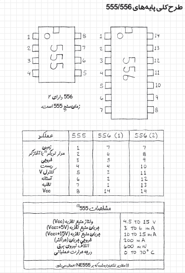 نکاتِ همگذاری یا سوار کردن مدار مدل های آزمایشی از مدارهایتان را، قبل از اینکه آن ها را دائمی کنید، برروی یک تخته مدار بدون لحیم بسازید. در مدارهایِ تک پایا، که در آن ها راه اندازیِ نادرست ممکن اس به بروزِ مشکلات منجر شود، پایه 5 را به زمین با یک خازن 0.1μF ببندید. اگر سیم رابط برق بلند، یا اینکه مداری در ظاهر دارایِ کارکرد بد است، یک خازن 0.1μF را بین پایههای 8 و 1 قرار دهید. یک خازن 1μF نیز ممکن است مورد نیاز باشد. مطمئن شوید که با مقادیرِ مربوط به مقاومتها و خازنهایِ زمان سنج آزمایش را انجام می دهید. مدارهایِ پایه ی 555 نقش این اجزا را تبیین می نمایند. به خاطر داشته باشید که شما می توانید از یک 556 به جای دو 555 استفاده نمایید. بعضی مدلهایِ با توانِ برقیِ پایینِ 555 ، ممکن است برای بعضی از مدارهایِ موجود در این بخش نیاز به بازبینی داشته باشند.