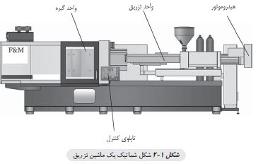 در شکل 1- 2 یک ماشین تزریق با کلیه تجهیزات مدرن نشان داده شده است. اجزای اصلی یک ماشین تزریق عبارتند از: واحد تزریق(واحد خمیری کردن مواد)، واحد گیره، واحد کنترل و در نهایت قالب.