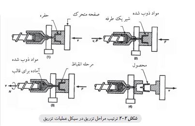 توالی رویدادهایی که در حین عملیات تزریق پلاستیک رخ میدهند در شکل 2- 2 نشان داده شده اند. ونام آن سیکل تزریق پلاستیک نامیده می شود. این چرخه هنگامی شروع می شود که مواد خمیری شده به درون قالب وارد شده و قالب بسته می شود. سپس هنگامیکه قالب پرشد، فشار نگهدارنده تا انقباظ و سردشدن قطعه باقی می ماند. درمرحله بعد مارپیچ چرخیده و آماده تغذیه دوباره قالب می شود. این عمل سبب میگردد مارپیچ به سمت عقب حرکت کرده تا قالب آماده پرشدن گردد. هنگامیکه قطعه به اندازه کافی سرد شد، قالب بازشده و قطعه به بیرون پرتاب می شود. شکل 3- 2 ترتیب رویدادهایی را که درحین یک سیکل تزریق رخ می دهد را نشان میدهد. همان طوریکه در این شکل دیده می شود، زمان خنک کاری از بقیه زمان ها بیشتر می باشد. ولی باید بدانید که این حالت همیشگی نبوده و برای همه موارد اینطور نیست. برای مثال هنگامی که تعداد حفره های قالب زیاد بوده و یا ضخامت دیواره قطعه نازک باشد. مجموع زمان سیکل تزریق را می توان از فرمول ذیل بدست آورد.